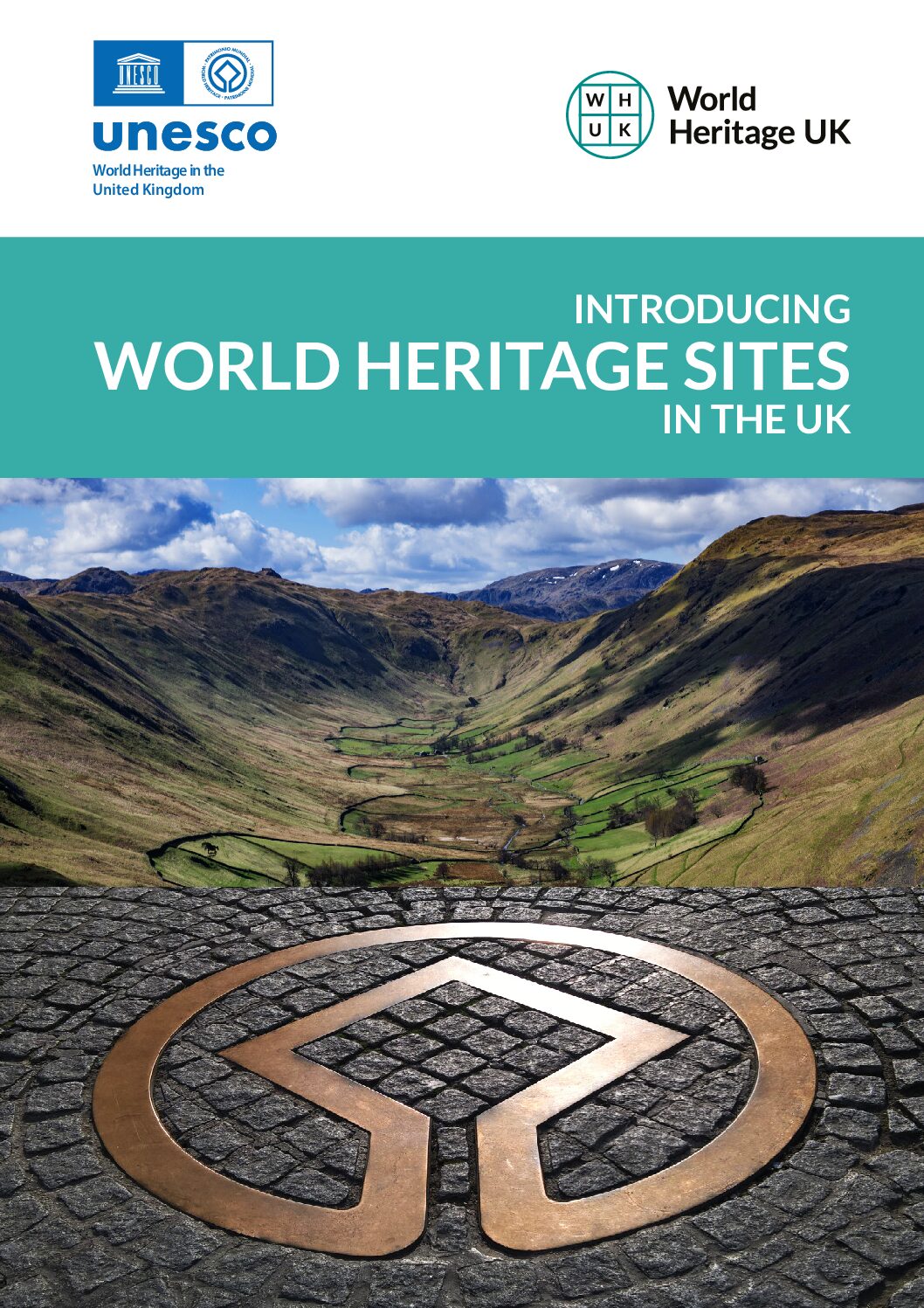 Pdf download of 2022's redesign of the World Heritage in the UK leaflet - snapshot of the Sites page only